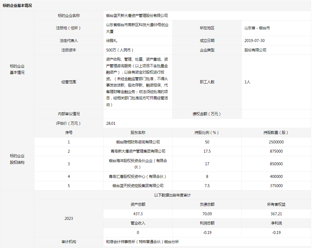 煙臺藍天新大唐資產(chǎn)管理股份有限公司7.5%股權(37.5萬股股份)