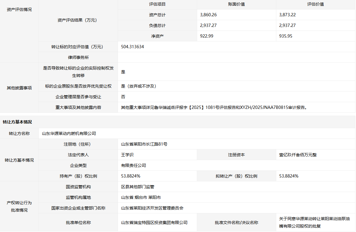 轉讓方: 山東華源萊動內燃機有限公司