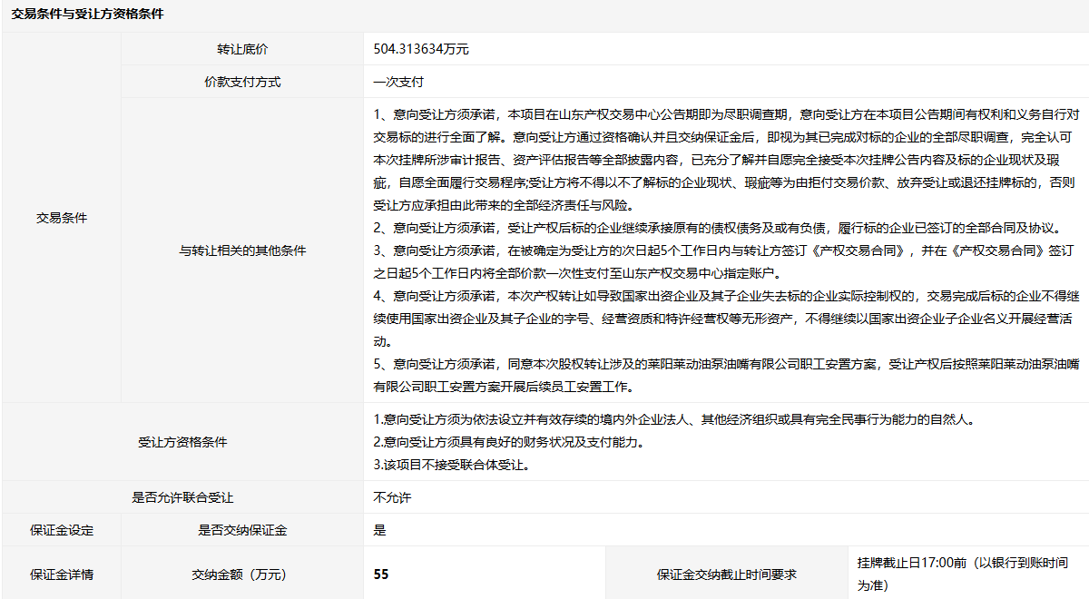 萊陽萊動油泵油嘴有限公司53.8824%股權
