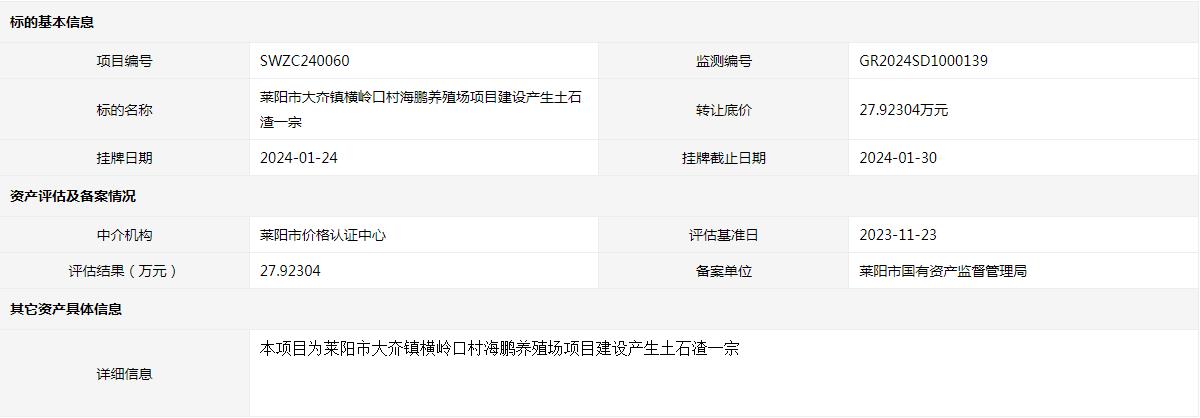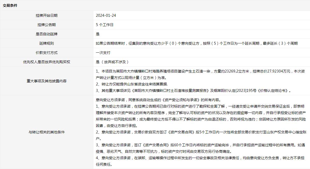 海陽市辛安鎮(zhèn)卓格莊村CX項目平整土地產(chǎn)生部分渣土一宗(1號標的)交易公告
