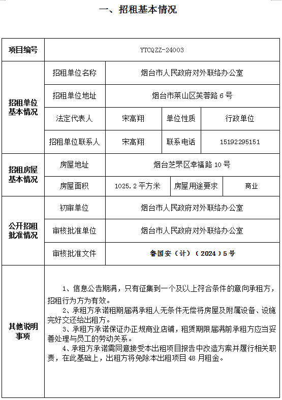 煙臺(tái)市南大街267號(hào)一樓東側(cè)門頭房招租公告